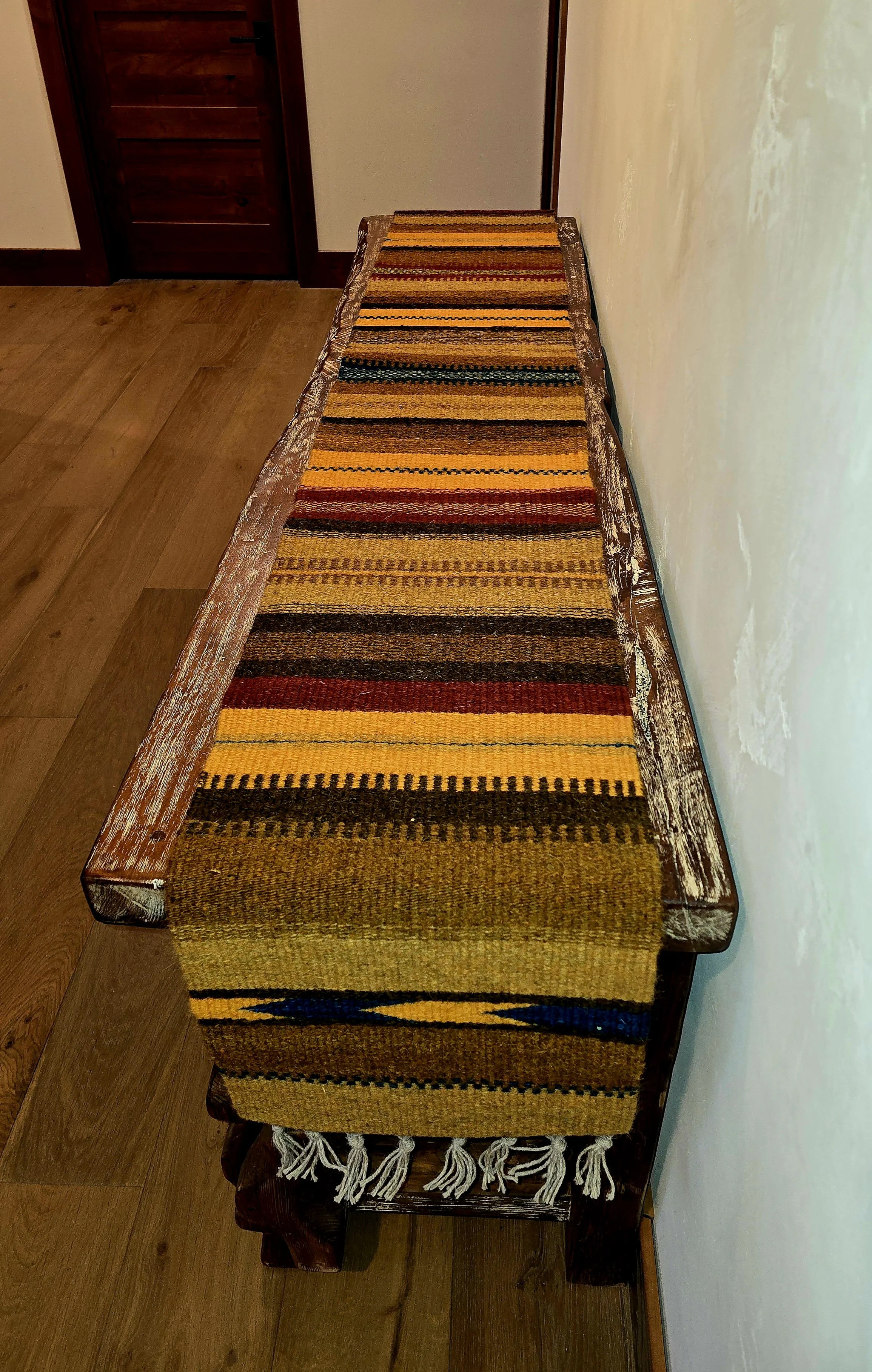 This warm color pallet displays continuous Río Grande stripes and motifs. Perfect as a table runner or durable enough for the floor as a hallway rug.